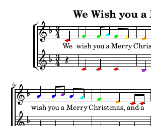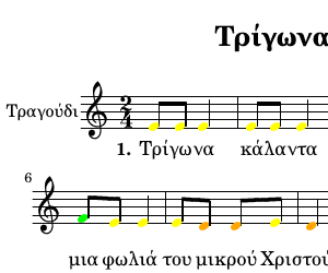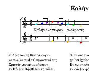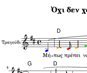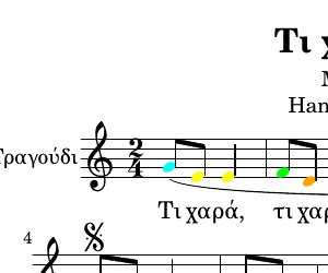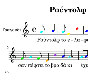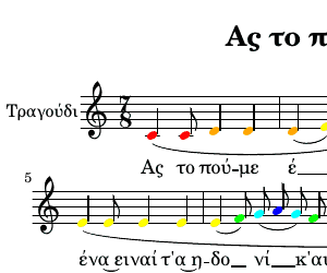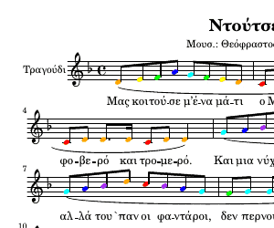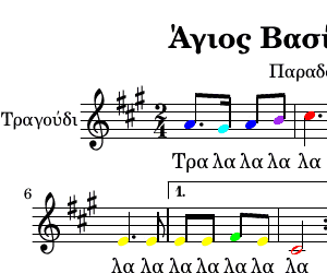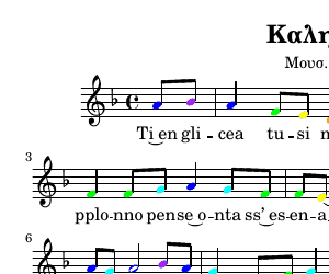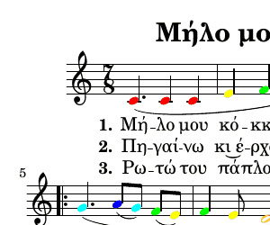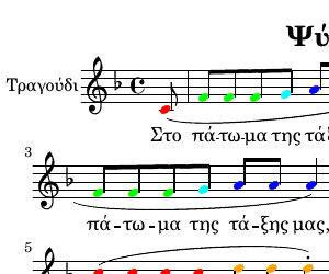 Επειδή η έγχρωμη εκτύπωση κοστίζει προτείνω φωτοτύπηση και τα παιδιά να χρωματίσουν τις νότες με το κατάλληλο χρώμα το οποίο αναγράφεται στο κάτω μέρος της πρώτης σελίδας. Κάποια τραγούδια είναι δύσκολα για παιδιά που δεν είναι προχωρημένα στην μουσική. Εδώ ένα παράδειγμα από μαθήτρια Β' τάξης.
