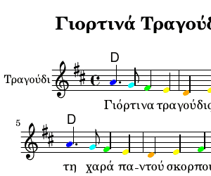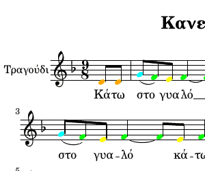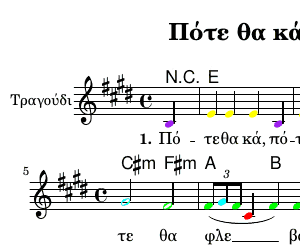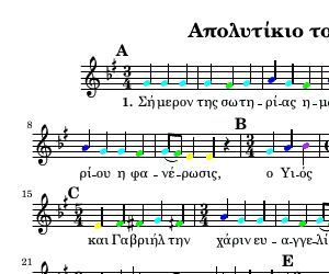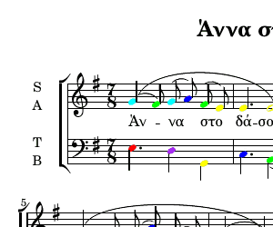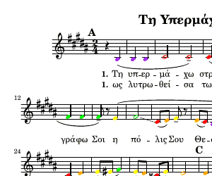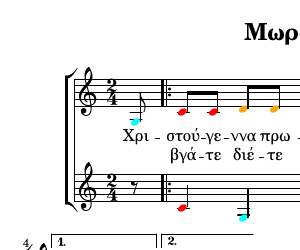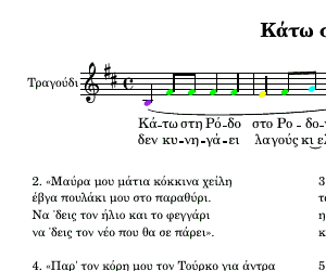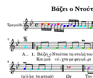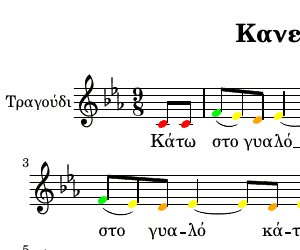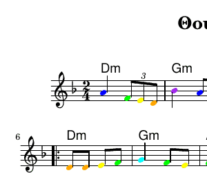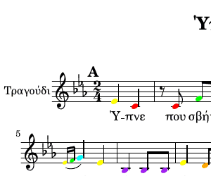 Για 25η Μαρτίου, το άκουσα στο youtube το έγραψα όπως το τραγούδι όχι όπως την παρτιτούρα η οποία έχει δύο μικρά λάθη. (μέτρο 6: λάθος συλλαβισμός, μέτρο 7: f e f αντί για f e d ). Έβαλα μερικές ανάσες.