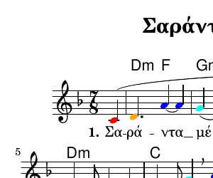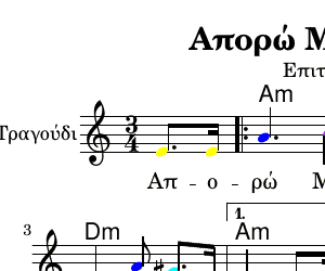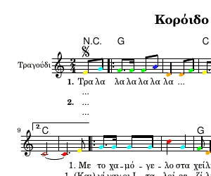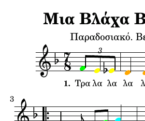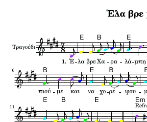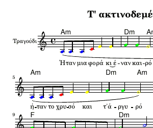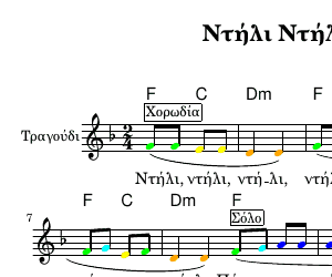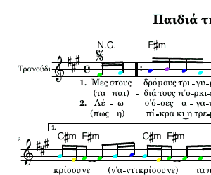 Παραδοσιακό κομμάτι. Έχω καταγράψει διαφορετικούς ρυθμούς από αυτούς που ακούγονται στο YouTube με την Δόμνα Σαμίου. Επίσης έχω αλλάξει μία νότα για απλούστευση. Έγραψα c c f es αντί του σωστού c c e es.